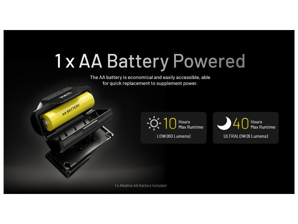- Napájanie umožňuje široký rozsah napätia a čelovka je kompatibilná s rôznymi batériami typu AA, ako sú alkalické, Ni-MH a lítiové batérie.