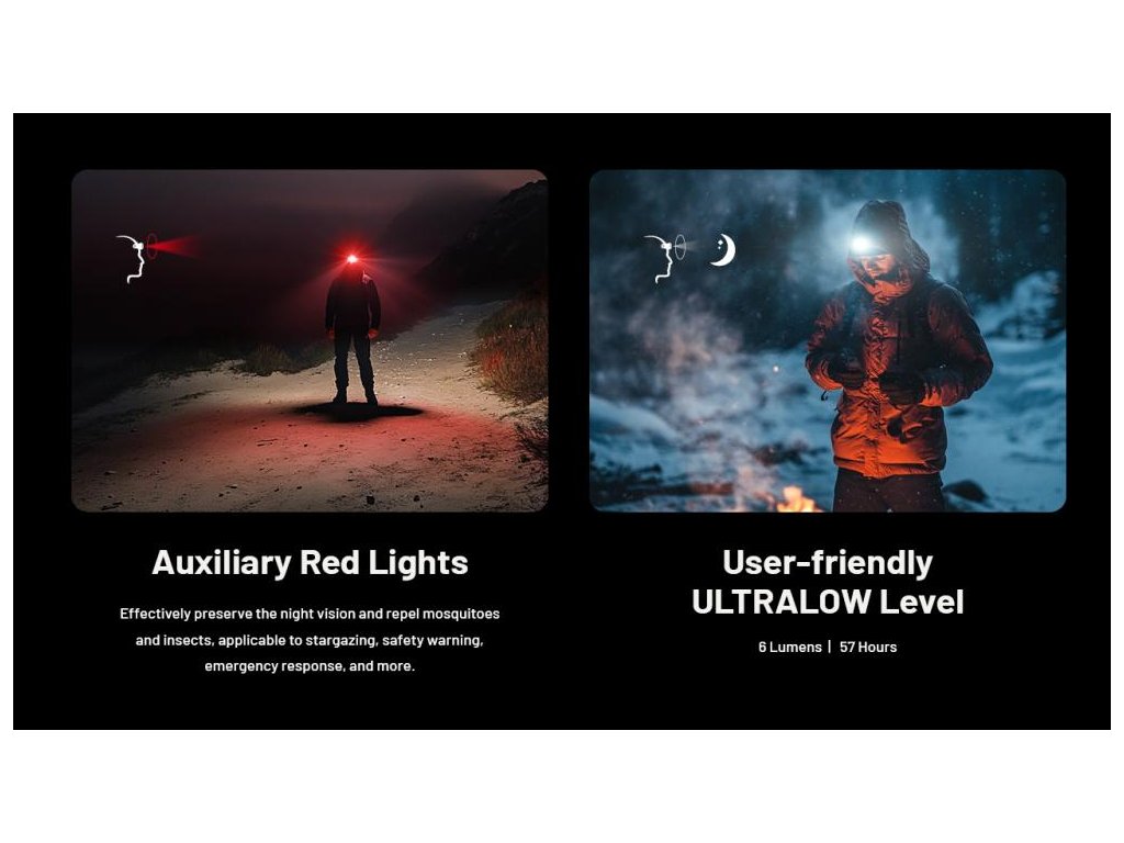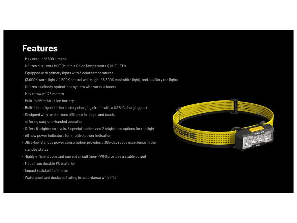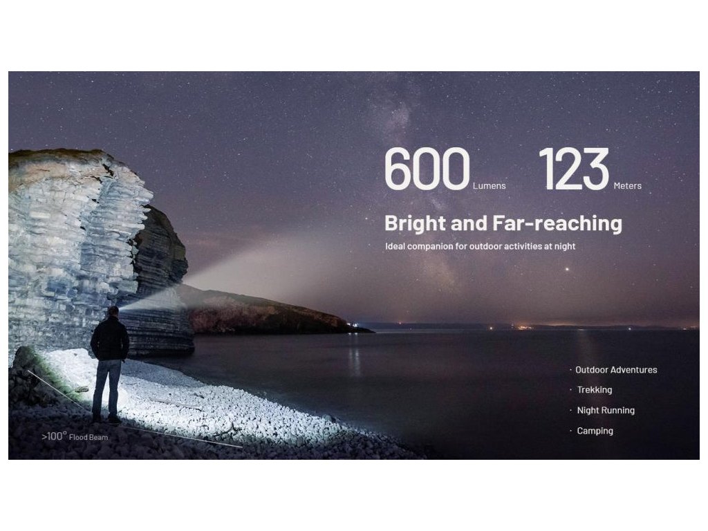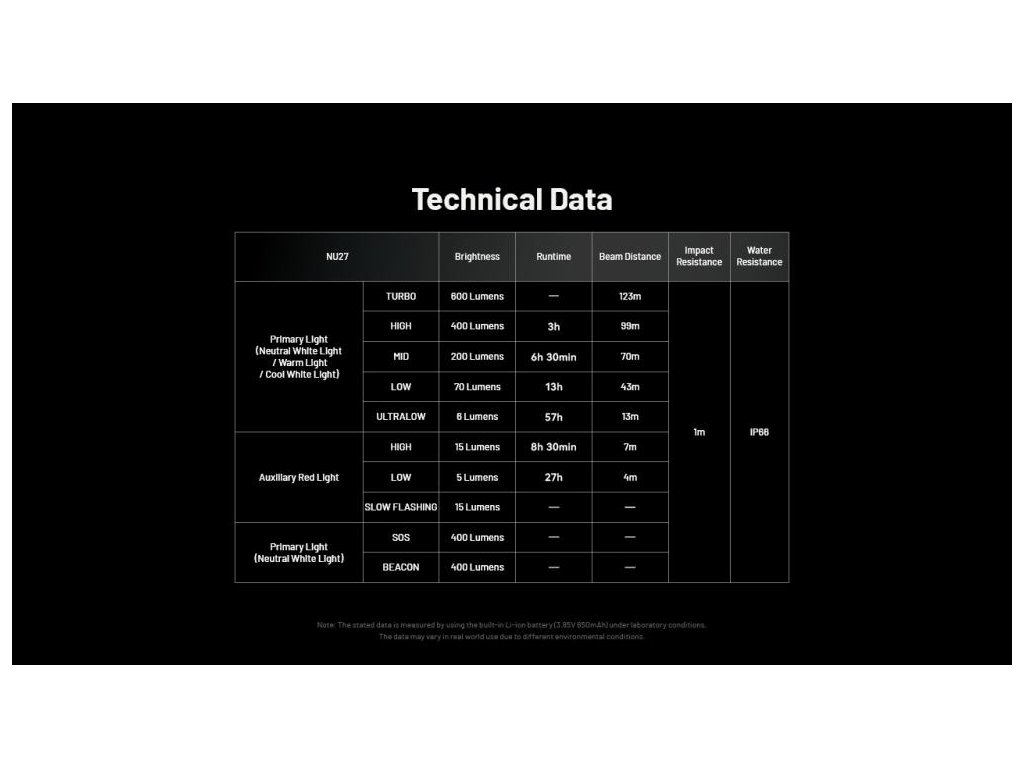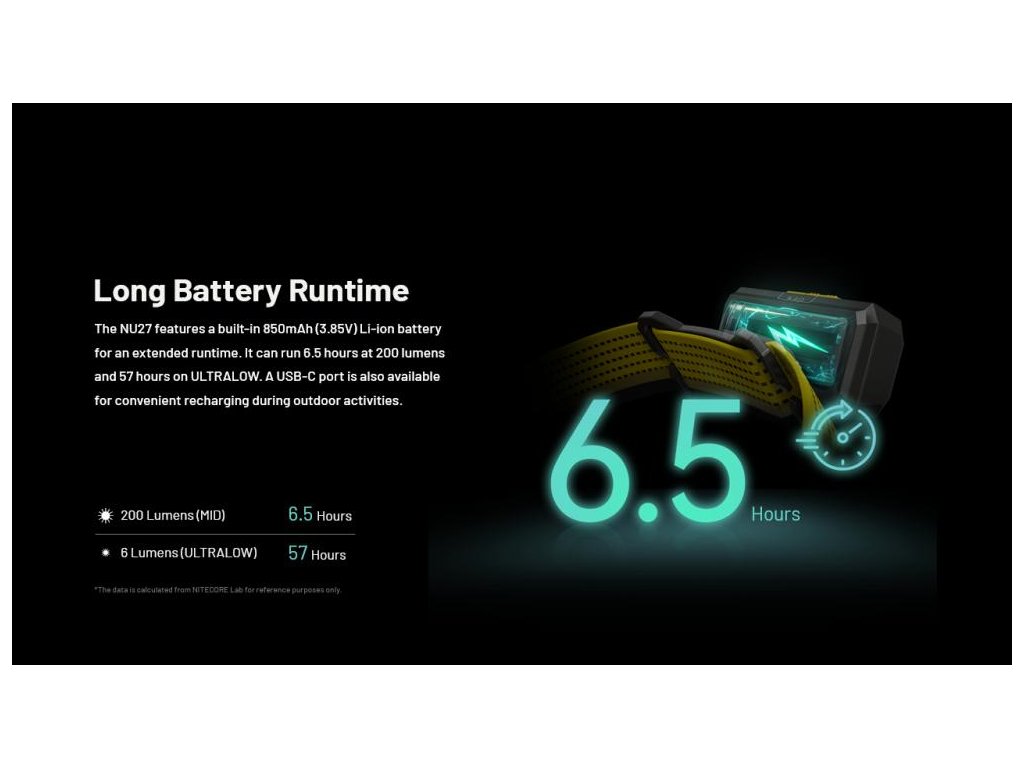 NU27 je štvor lúčové svietidlo na čelo s USB-C dobíjacím portom.