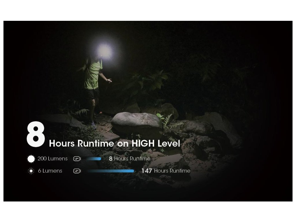Poznámka: Batériu je potrebné nabiť, keď sa výstup zdá slabý alebo čelovka prestane reagovať z dôvodu nízkeho napájania.