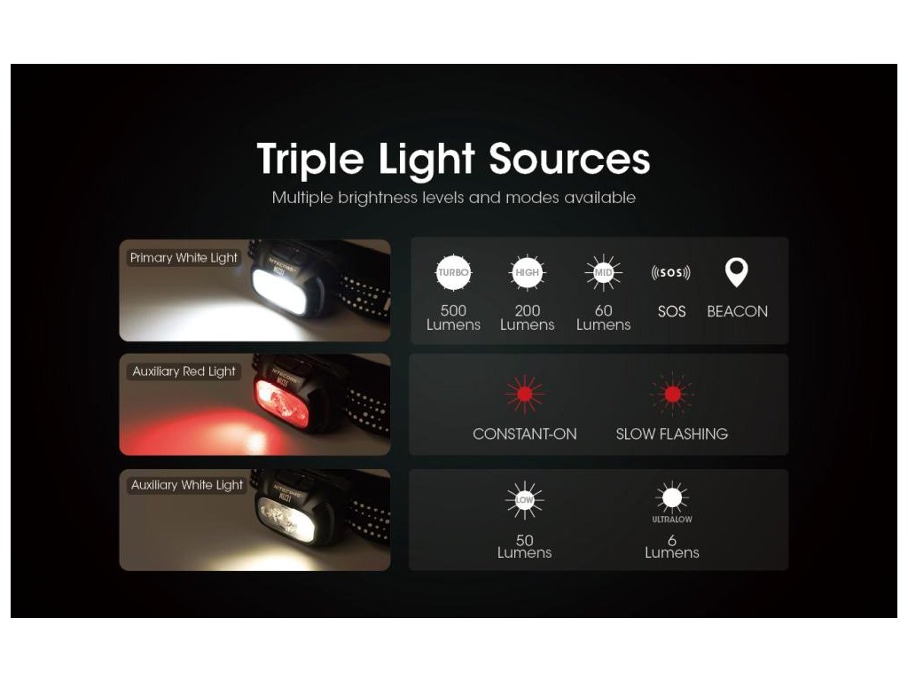 Keď je svietidlo zapnuté, krátkym stlačením tlačidla režimu (MODE) môžete prepínať medzi nasledujúcimi zdrojmi svetla: hlavné biele svetlo – pomocné biele svetlo – pomocné červené svetlo.