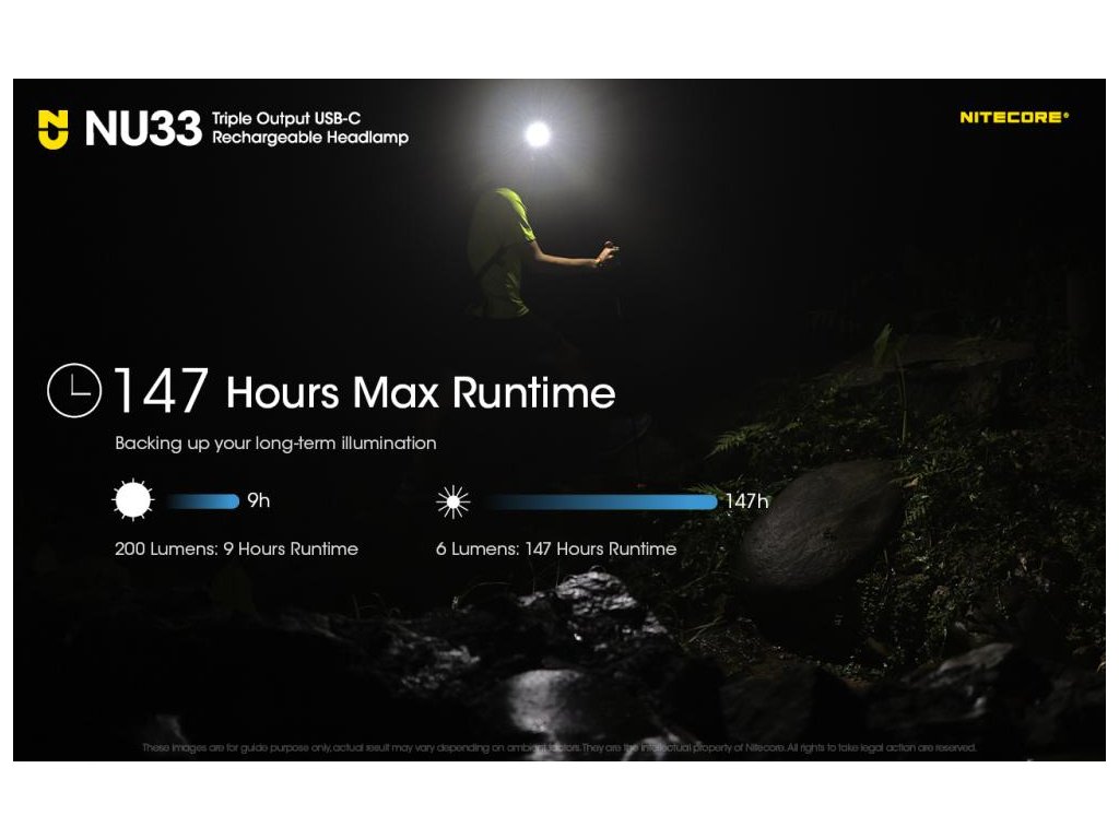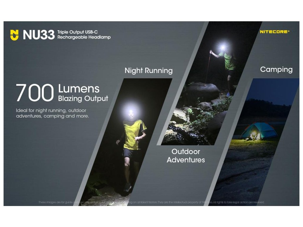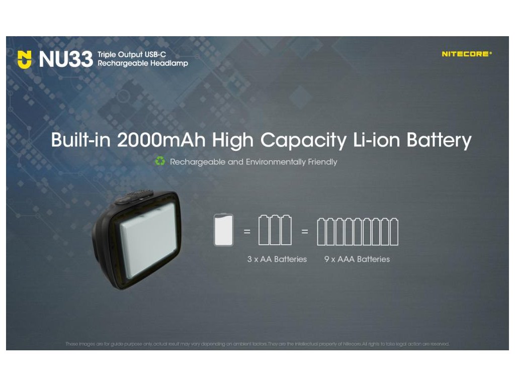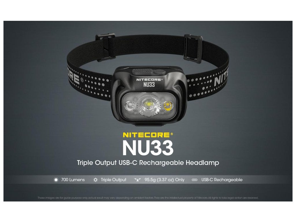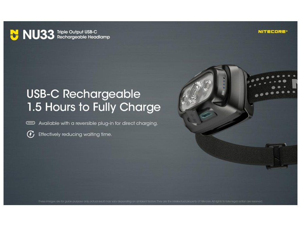 Pred prvým použitím otvorte uzáver nabíjacieho portu. Nabite batériu svietidla NU33 pomocou USB-C kábla pripojenim na externý zdroj napájania (adaptér, počítač, iné USB nabíjacie zariadenie). Nabíjací proces trvá približne 1,5 hodinu. Plne nabité svietidlo vydrží v pohotovostnom režime cca. 12 mesiacov.