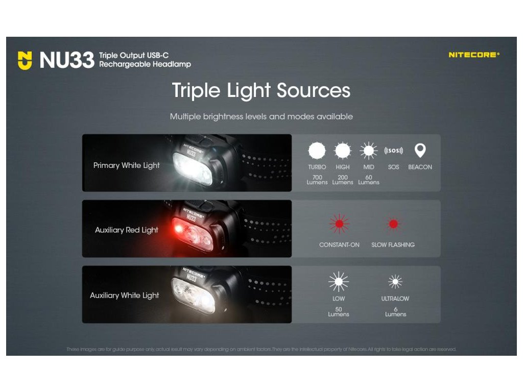 Keď je svietidlo zapnuté, krátkym stlačením tlačidla režimu (MODE) môžete prepínať medzi nasledujúcimi zdrojmi svetla: hlavné biele svetlo – pomocné biele svetlo – pomocné červené svetlo.