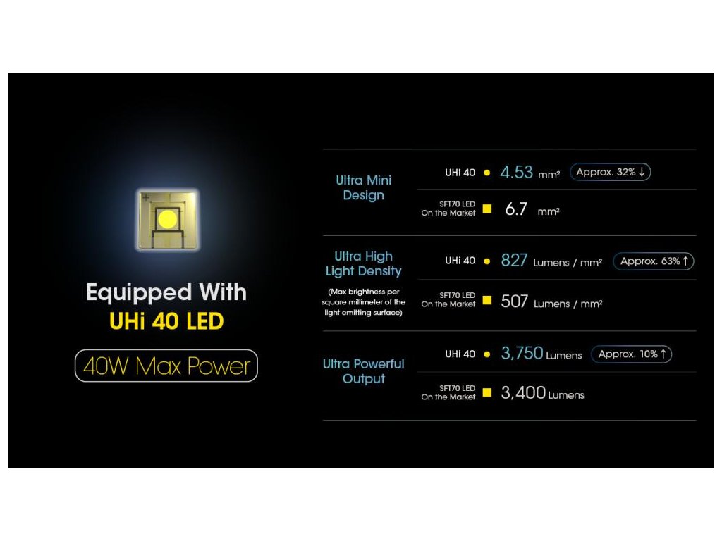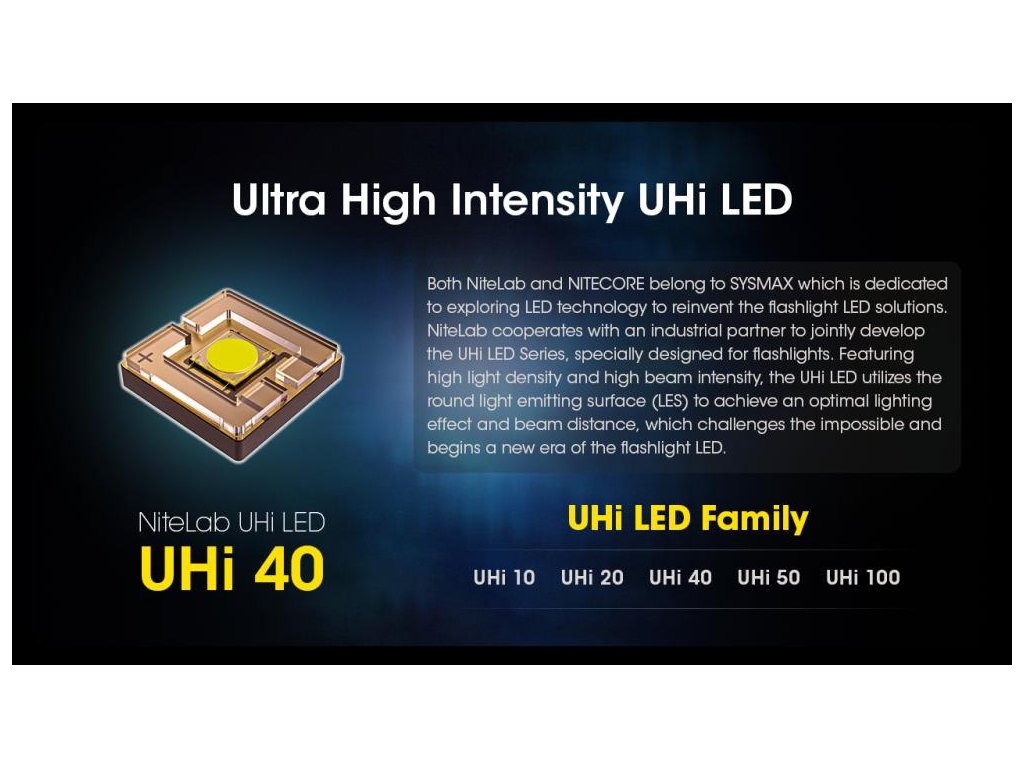 - Používa vysoko kvalitnú LED diódu NiteLab UHi 40 LED