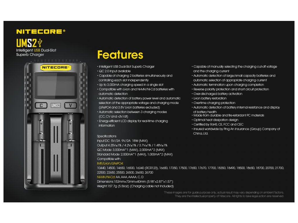 -kompatibilné s: IMR/Li-ion/LiFePO4: 10440, 14500, 14650, 16500, 16340(RCR123), 16650, 17350, 17500, 17650, 17670, 17700, 18350, 18490, 18500, 18650, 18700, 20700, 21700, 22500, 22650, 25500, 26500, 26650, 26700, Ni-MH/Ni-Cd: AA, AAA, AAAA, C, D