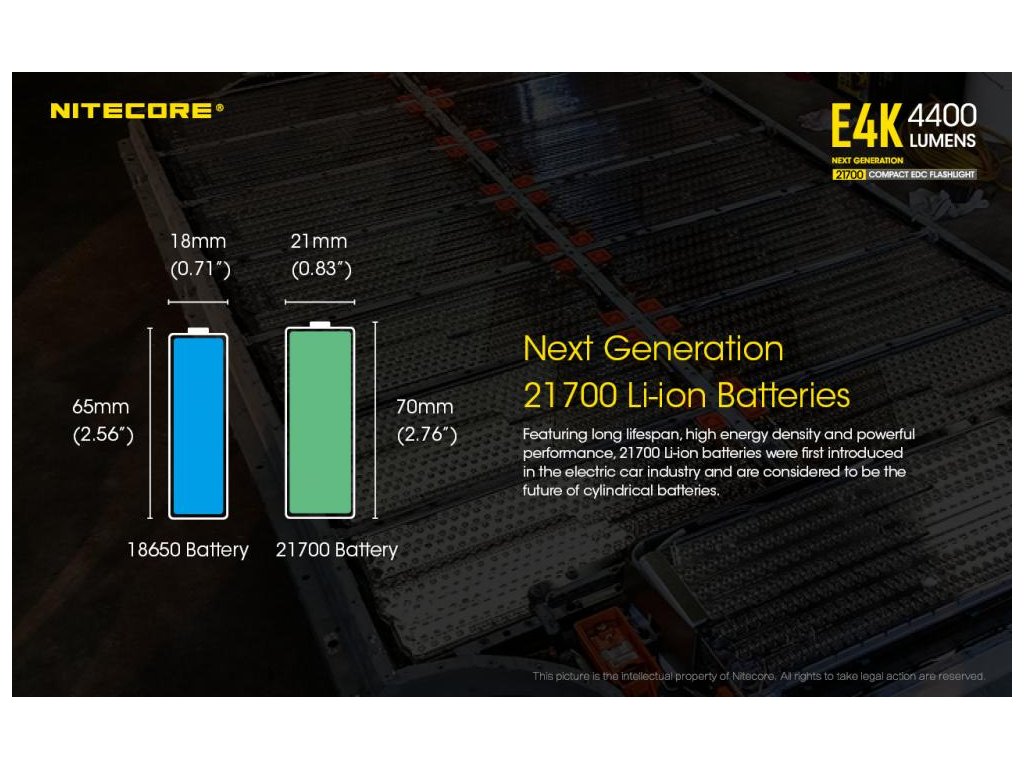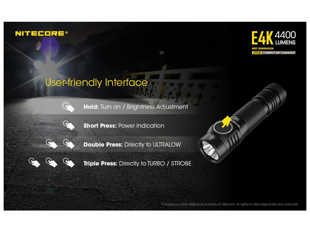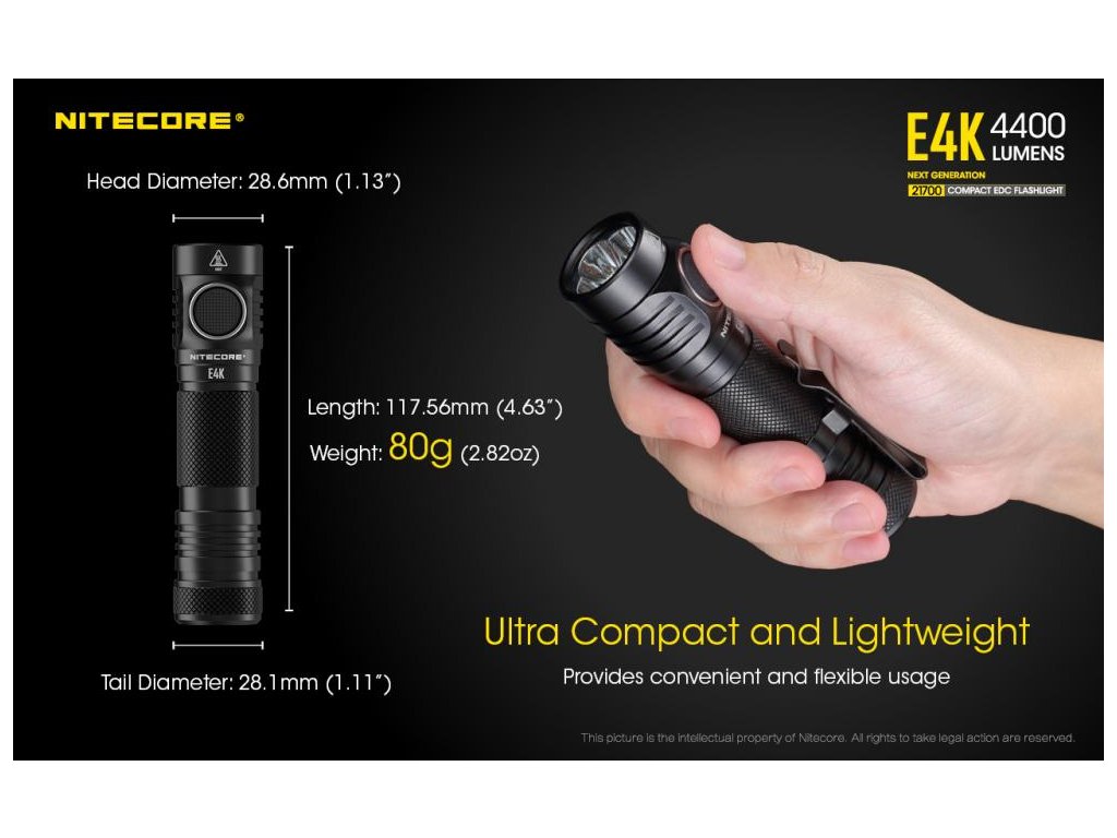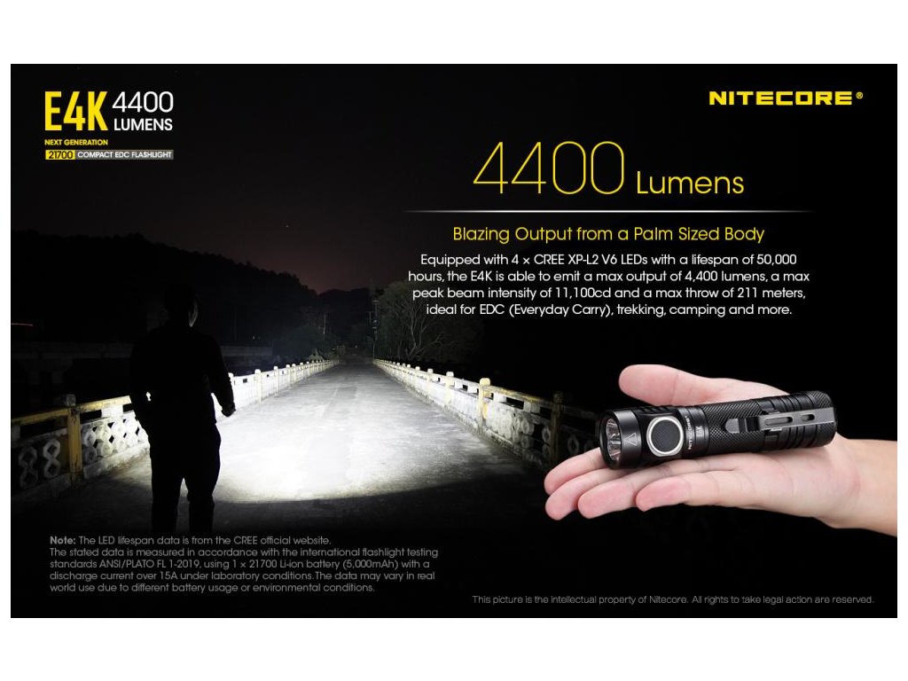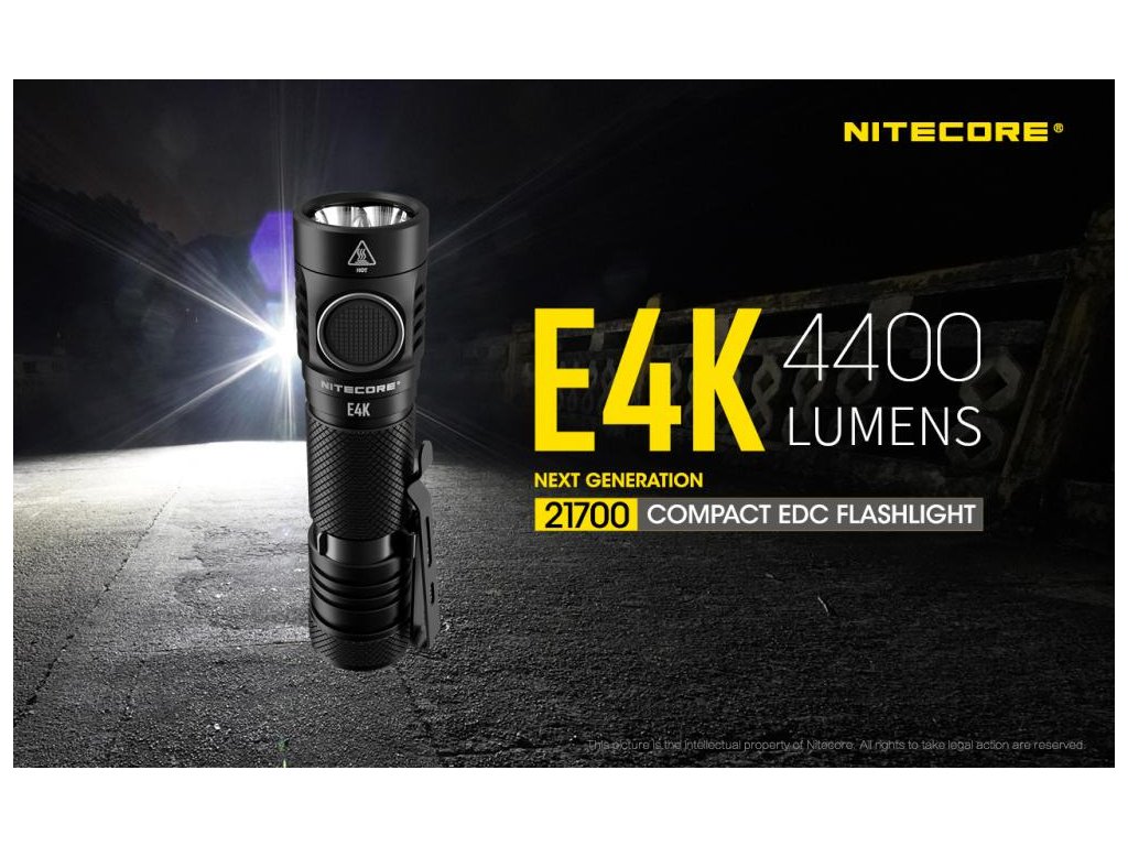 - E4K je svietidlo EDC (Every day carry) ďalšej generácie s batériou typu 21700 určené pre denné nosenie.