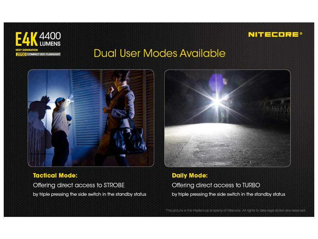 Svietidlo E4K poskytuje dva užívateľské režimy, DENNÝ a TAKTICKÝ pre rozličné situácie.