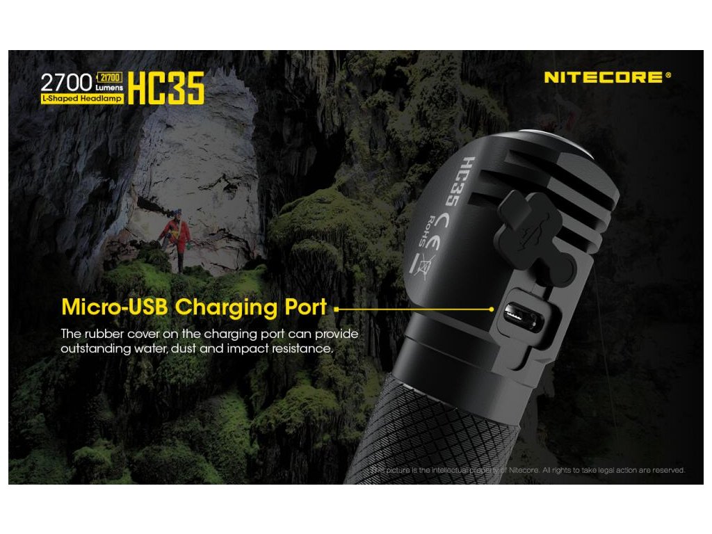 - Svietidlo HC35 je vybavené inteligentným nabíjacím obvodom. Ako je znázornené na obrázku, jeden koniec pripojte k externému nabíjaciemu zariadeniu (adaptér, počítač...) a druhý koniec do portu na hlave svietidla pod gumenou krytkou.