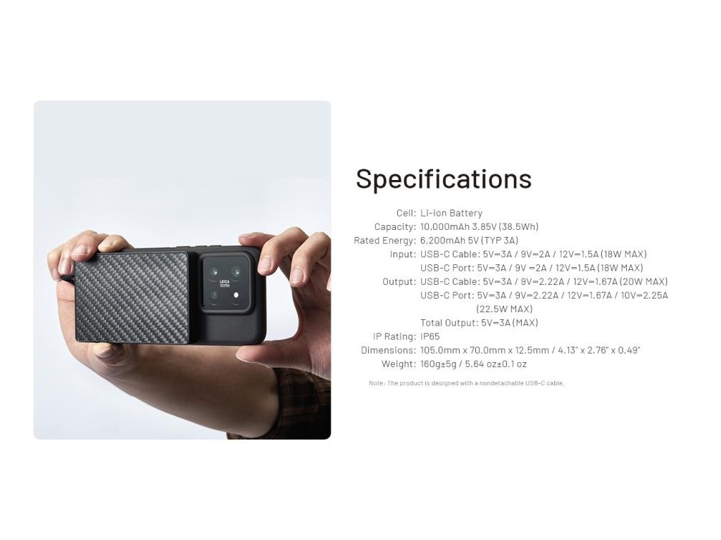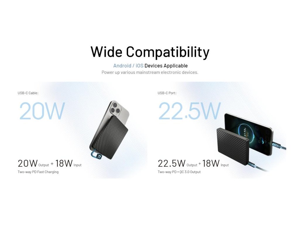 -port USB-C: 5V=3A / 9V=2,22A / 12V=1,67A / 10V=2,25A (22,5W MAX)