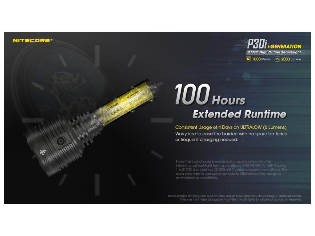 - Svietidlo je napájané batériou typu 21700 série i, kompatibilné je aj s batériou CR123 a poskytuje prevádzkovú dobu až do 100 hodín (viac ako 4 dni).