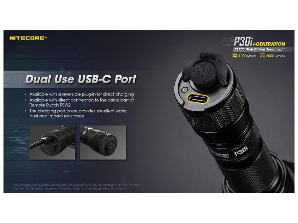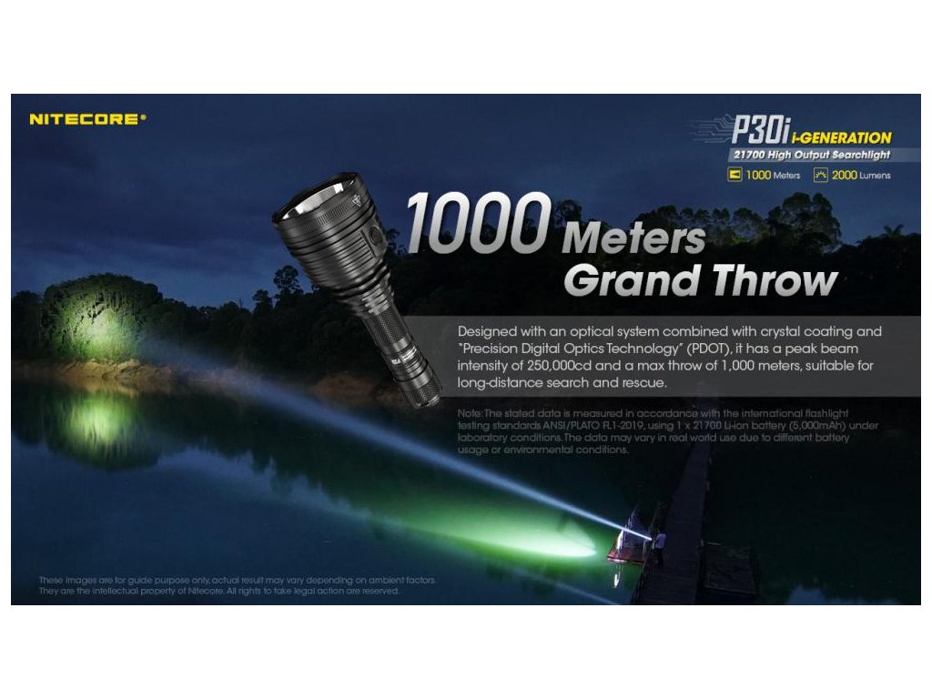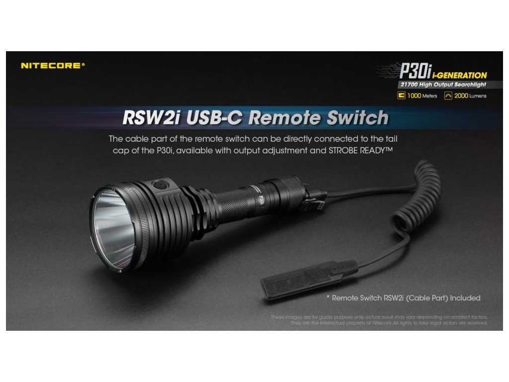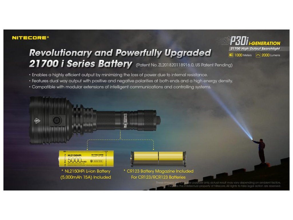 - Svietidlo je dodávané s Li-ion batériou NITECORE 21700 (NL2150HPi, 5 000 mAh) a s diaľkovým káblovým ovládačom RSW2i.