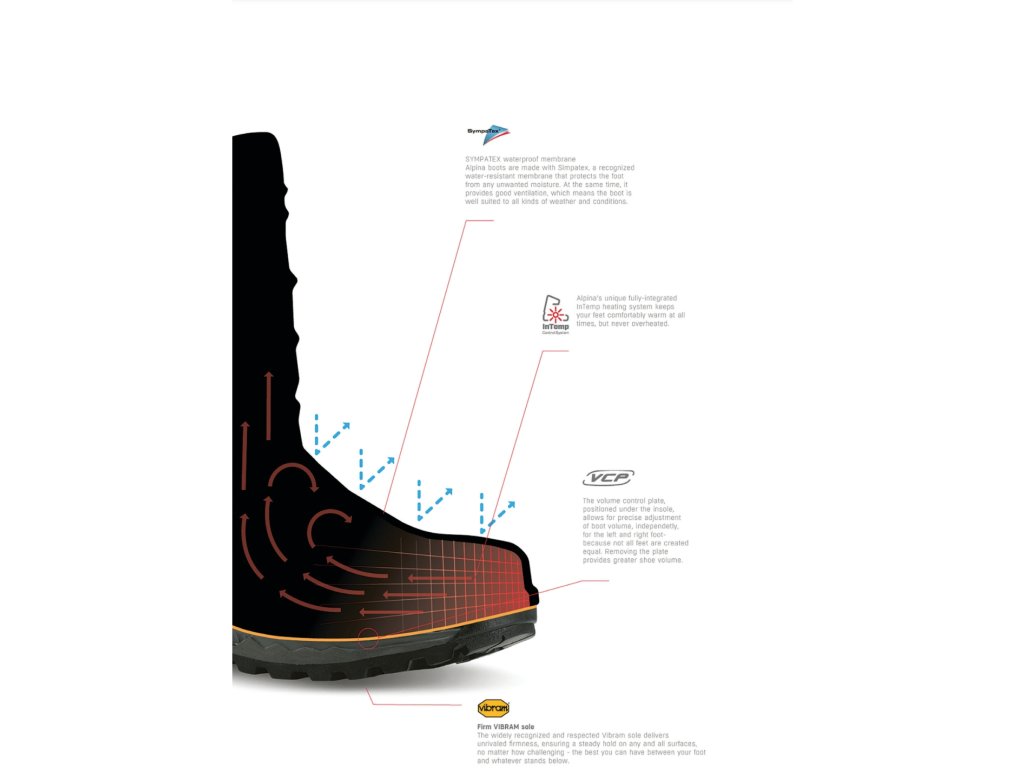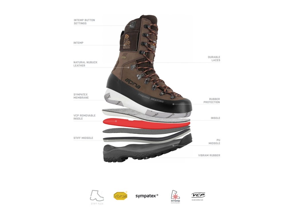 Robustná kožená obuv Alpina Hunter Heat s inovatívnym systémom vyhrievania InTemp , ktorý je umiestnený vo vrchnej časti nad priehlavkom a prstami. Nedôjde tak k postupnému vyšľapaniu vyhrievacích vlákien, ako tomu je u bežných vyhrievacích vložiek. Batéria je potom šikovne ukrytá na vrchnej strane topánky pod ochranným krytom na suchý zips a napája spomínanú vyhrievaciu lamelu v prednej časti topánky. Odtiaľ potom teplo vzlína do celej topánky. Žiadne vyčnievajúce káble, žiadne batérie, ktoré používateľ môže počas chôdze v ťažkom teréne stratiť alebo poškodiť. Stlačením jedného tlačidla máte počas chvíľky obuv príjemne vyhriatu.